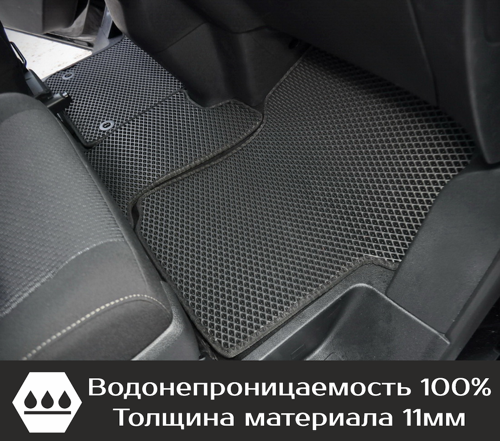 Толщина ковриков EVA составляет 10-12 мм. Глубина ячеек 7-8 мм. Такая толщина ковриков позволяет им служить довольно долго, не протираясь до 3 лет. А благодаря такой глубине ячеек коврик EVA площадью 1 кв.м. способен захватить около 3,5 л жидкости, сохраняя в чистоте вашу обувь и обивку салона.