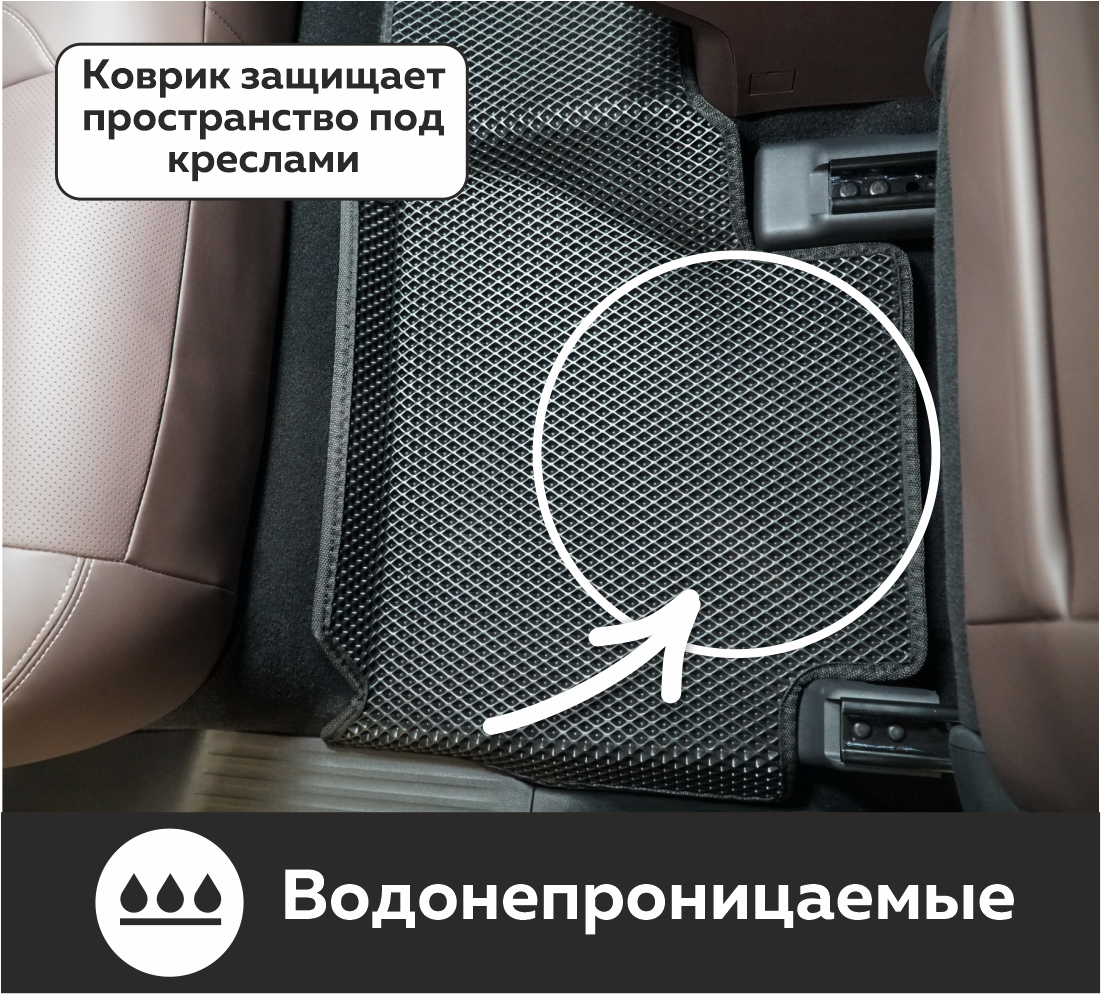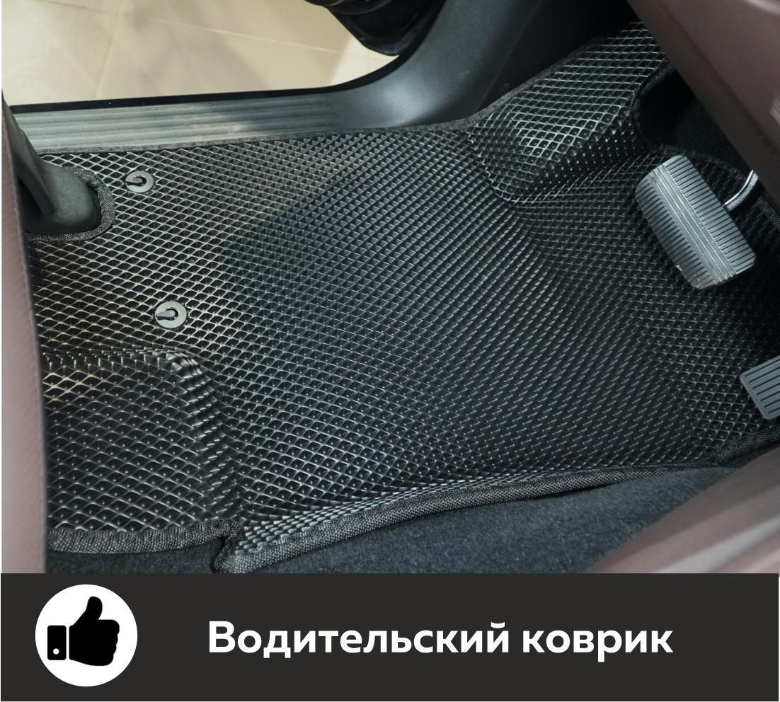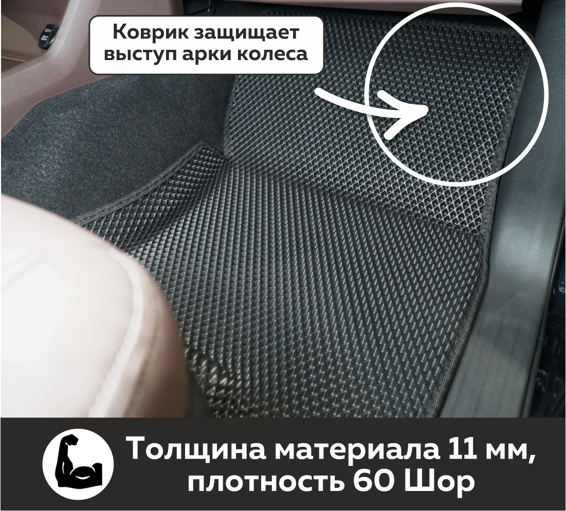 Толщина ковриков EVA составляет 10-12 мм. Глубина ячеек 7-8 мм. Такая толщина ковриков позволяет им служить довольно долго, не протираясь до 3 лет. А благодаря такой глубине ячеек коврик EVA площадью 1 кв.м. способен захватить около 3,5 л жидкости, сохраняя в чистоте вашу обувь и обивку салона.