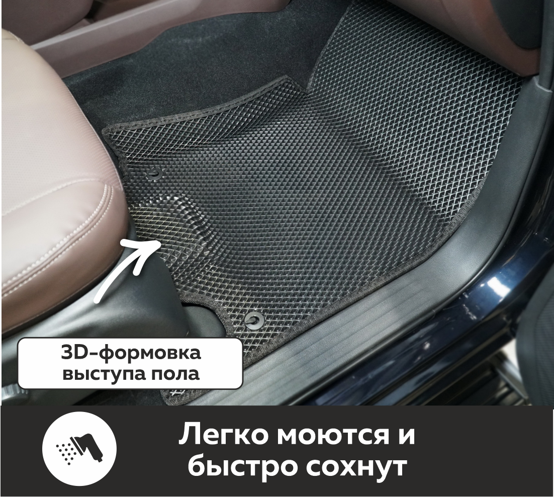 Изделия EVA имеют специальную ячеистую структуру (ячейки глубиной 8 мм), которая эффективно задерживает грязь и воду, оставляя вашу обувь и поверхность обивки салона или багажника абсолютно чистыми. Также эти ячейки очень легко и быстро очищаются без применения специальных инструментов, в том числе, при помощи бесконтактной мойки.