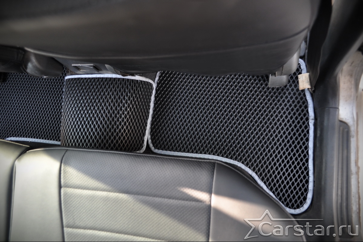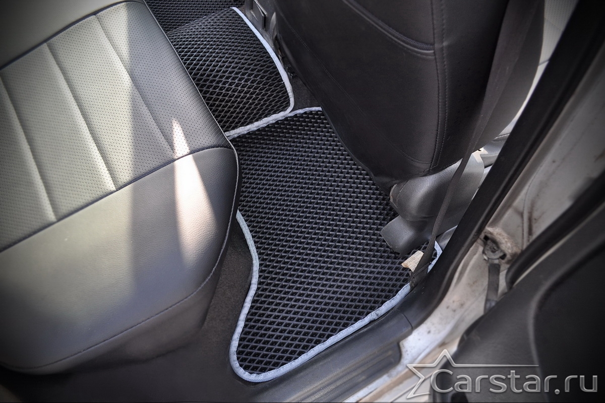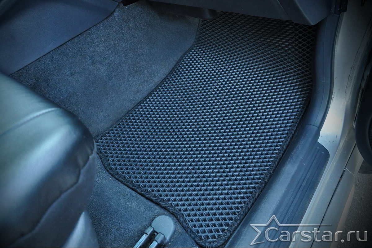 Толщина ковриков EVA составляет 10-12 мм. Глубина ячеек 7-8 мм. Такая толщина ковриков позволяет им служить довольно долго, не протираясь до 3 лет. А благодаря такой глубине ячеек коврик EVA площадью 1 кв.м. способен захватить около 3,5 л жидкости, сохраняя в чистоте вашу обувь и обивку салона.
