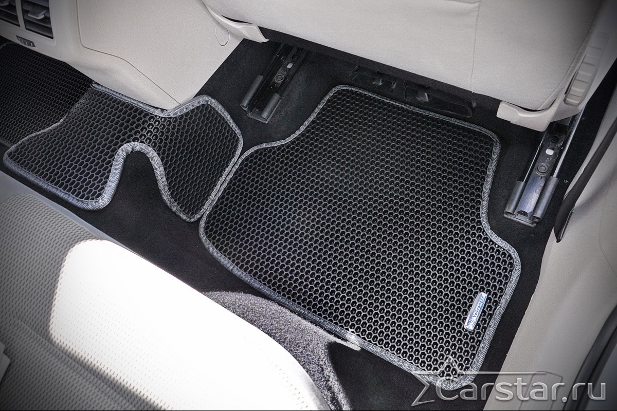 Толщина ковриков EVA составляет 10-12 мм. Глубина ячеек 7-8 мм. Такая толщина ковриков позволяет им служить довольно долго, не протираясь до 3 лет. А благодаря такой глубине ячеек коврик EVA площадью 1 кв.м. способен захватить около 3,5 л жидкости, сохраняя в чистоте вашу обувь и обивку салона.