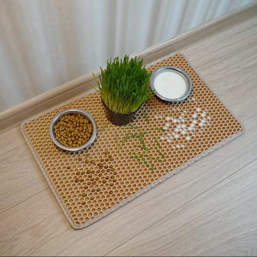 Оптимальный размер коврика 30*50 см позволяет разместить на нём до 3 мисок. Эстетическая окантовка текстильной стропой по краю коврика придаёт аккуратный вид изделию. Ячейки коврика надёжно собирают остатки корма и жидкости, не распространяя содержимое по полу квартиры.
